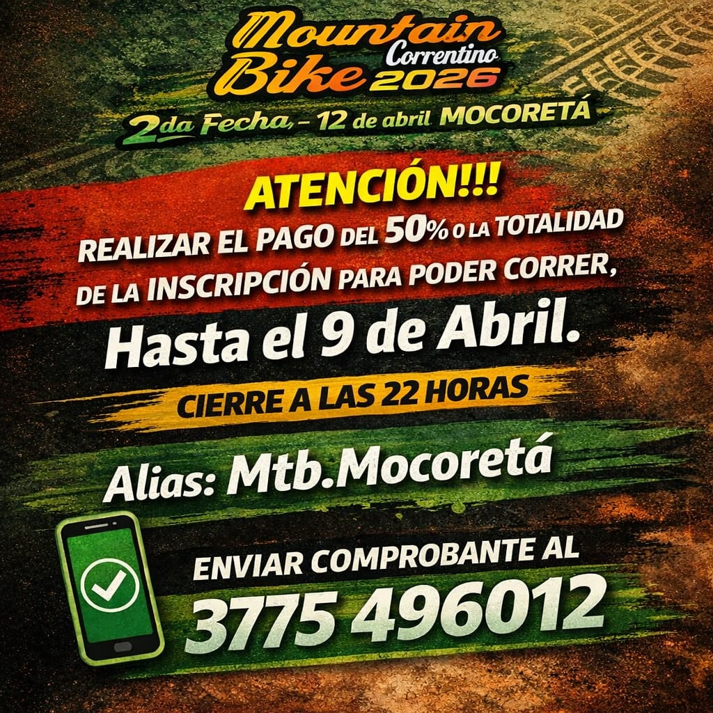 INSCRIPCIONES Costo base: $30.000 (incluye seguro, hidratación, kit , fiscalización y almuerzo para ciclista) Pago: 50% al inscribirse $15.000 (enviar comprobante) 50% restante antes del jueves previo a las 22:00 hs Valores: En término: $30.000 Fuera de término: $37.500 (el saldo aumenta un 50%) Ejemplo: Paga $15.000 al inscribirse Si paga en término: $15.000 → Total $30.000 Si paga fuera de término: $22.500 → Total $37.500 Condiciones: No hay reembolsos ni transferencias ¡¡ INSCRIPCIÓN OBLIGATORIA ANTES DEL JUEVES 22:00hs. !! Quien no cumpla, no podrá correr.